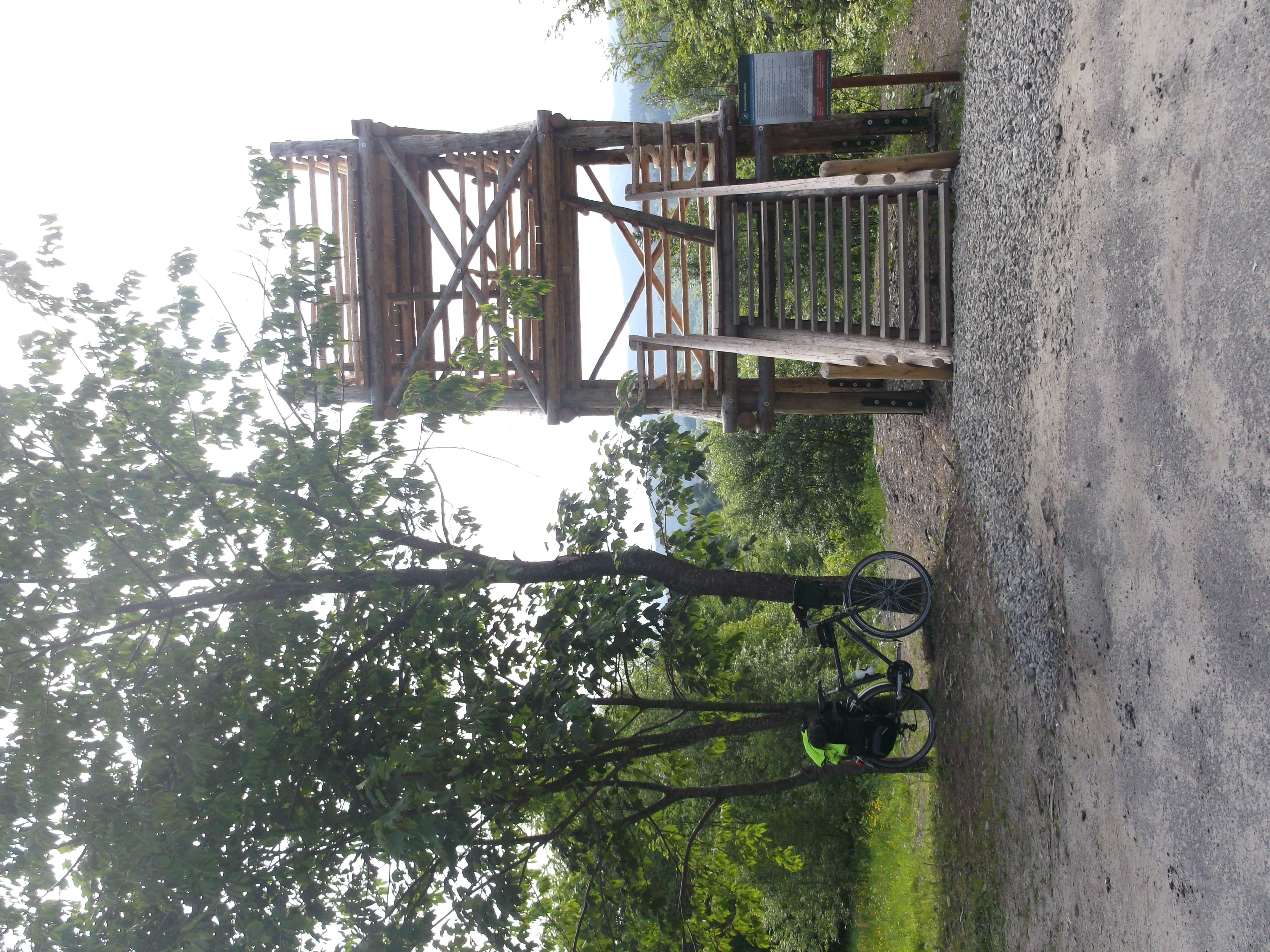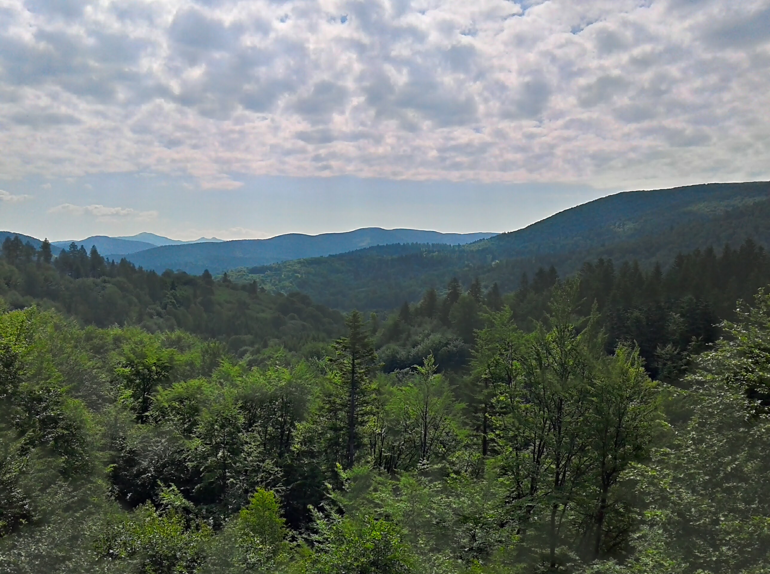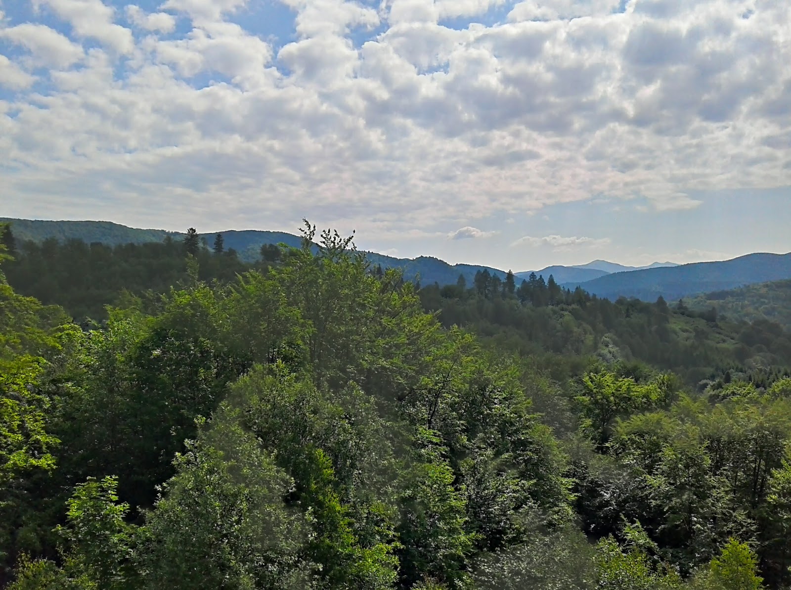 Ostatni z podjazdów przed Komańczą na szczycie wynagradza mnie nowa wieżą widokową. Jest więc pretekst na drugie śniadanie i chwilę odpoczynku. Miejsce niby odludne, ale co chwilę ktoś przyjeżdża samochodem i z mozołem wdrapuje się na górny taras. Moje nogi o dziwo radzą sobie całkiem nieźle ze schodami.
