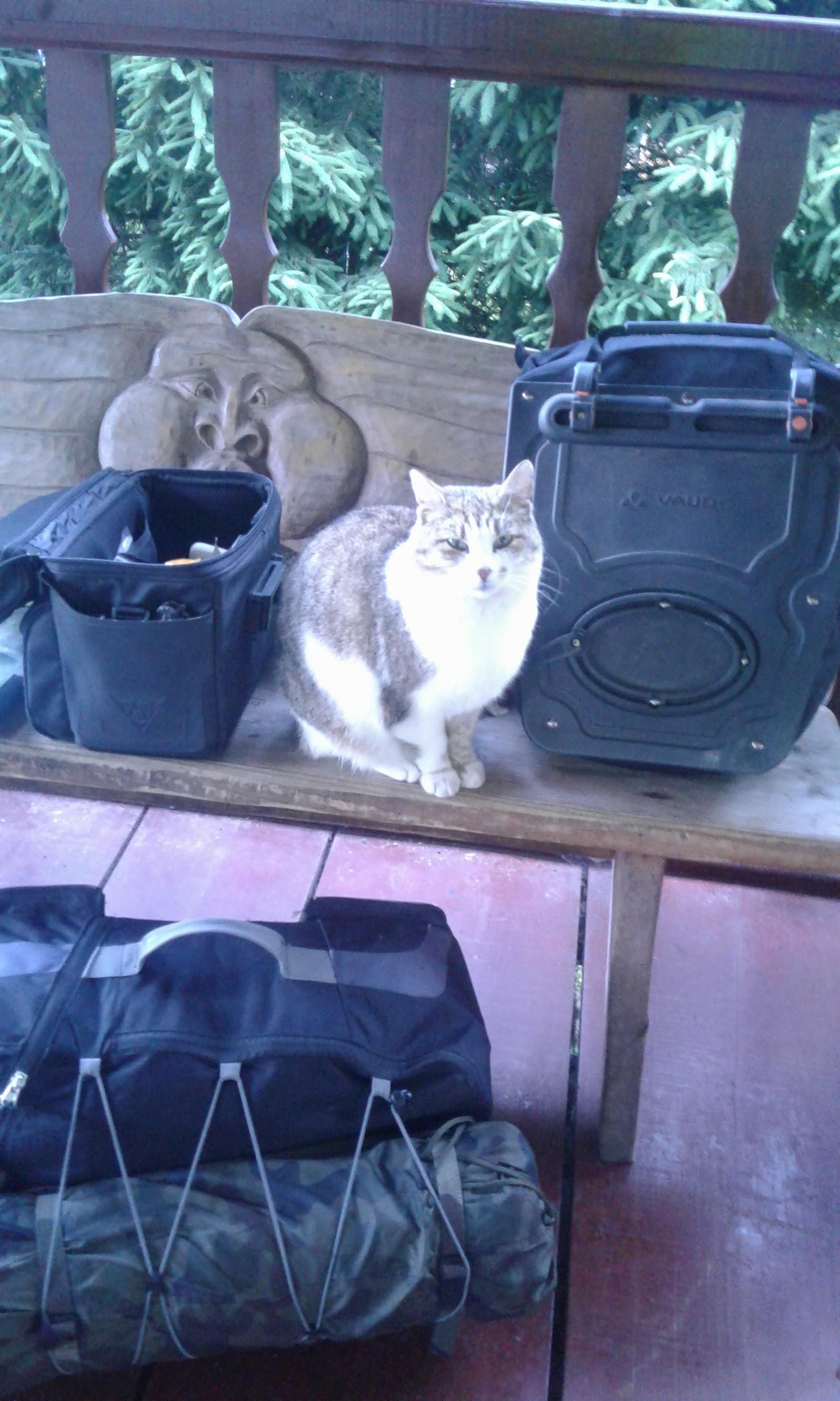 Szybka pobudka i po lekkim śniadaniu wyjazd przed godziną szóstą na trasę. Kot gospodarzy wygląda jak by chciał wpakować mi się do sakwy i pojechać ze mną na wyprawę. Na szczęście dla mnie i dla kota nie było już miejsca w sakwach.