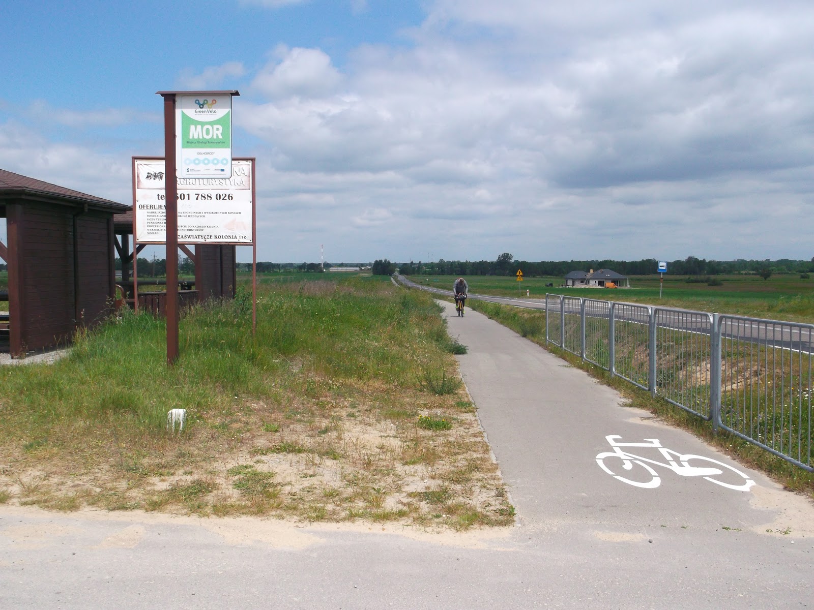 Ruch na drodze jest praktycznie zerowy. Szkoda, że ścieżki rowerowe takie jak w tym miejscu nie zostały zbudowane przy ruchliwych odcinkach dróg gdzie roweżyści muszą na jezdni walczyć o życie z TIRami. Czasem mija nas też ekologiczny pojazd zaprzęgnięty w koniki.