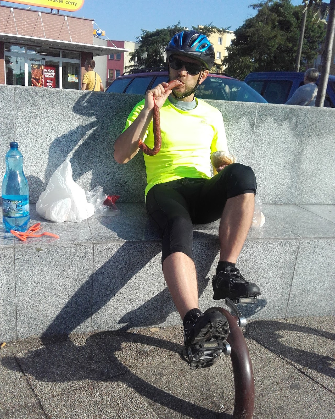 Zjadamy pyszny obiad wielodaniowy i ruszamy w dalszą drogę przez miejscowości z coraz bardziej dziwnie brzmiącymi nazwami. Ruch mały i pogoda ładna więc kilometry mijają nie wiadomo nawet kiedy. Obowiązkowe przystanki na pamiątkowe zdjęcie, szukanie keszyka w dziupli i już widać Bartoszyce.