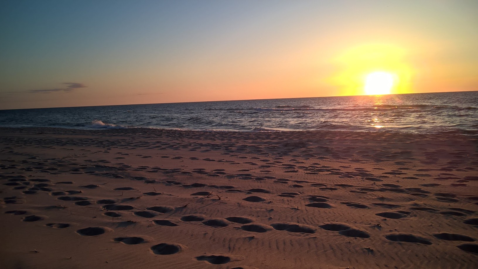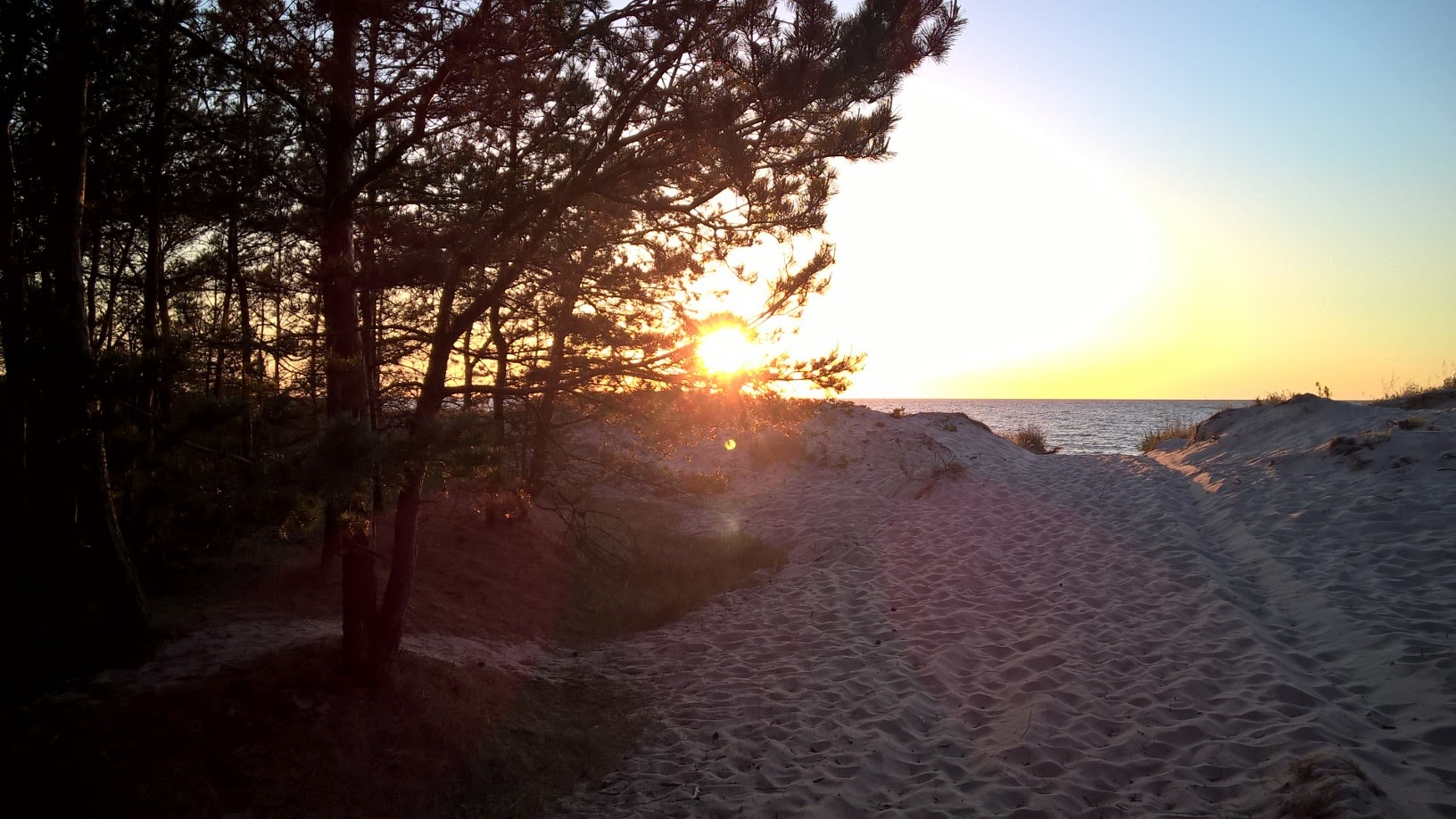 Tego dnia wieczorem po kąpielach (pod prysznicem) i lekkim jedzonku postanowiliśmy w końcu zobaczyć morze z bliska. Właśnie zbliżał się zachód słońca więc okazja na spacer na plażę była doskonała. Wystarczyło tylko przejść przez wydmę. Nie wiedzieliśmy jeszcze, że wycieczka na plażę nie była zupełnie potrzeba bo następnego dnia czeka nas spacerek po piachu z rowerami.